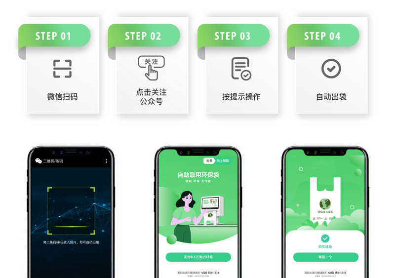 自助取袋機(jī)/環(huán)保袋發(fā)放機(jī)可以自助領(lǐng)取環(huán)保袋,居民可以免費領(lǐng),操作和無人自助售貨機(jī)一樣的。拿出手機(jī)掃碼一下二維碼,機(jī)器自動吐出環(huán)保袋。生活上對居民的出行提供了很大的便利,也通過免費領(lǐng)的方式增強(qiáng)了人們生活中綠色出行、低碳環(huán)保的意識。大尺寸的觸摸屏和環(huán)保袋同時也是廣告載體,能夠為各個區(qū)域商戶定制設(shè)計不同廣告,給人視覺感受。每一個機(jī)器和購物袋在使用過程中相當(dāng)于人形廣告牌。